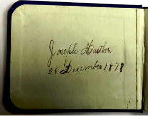 In the Homestead attic there is a large, curved-top, hide-covered trunk. Inside, a small blue book with the simple title: “Autographs.” Written on the flyleaf: “Joseph Mather December 25, 1878.”