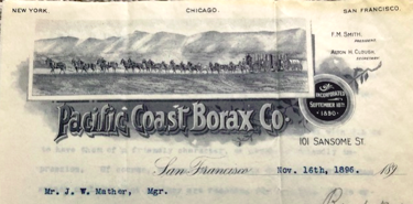 In an August 7, 1898 letter to his father, Stephen Mather wrote, “I hear that Mr. Smith is getting near the consummation of his pet project to consolidate the borax business of the world, absorbing the Turkish and So American companies…The trouble with Smith is he doesn’t think anyone else but himself has any right in the borax business…”